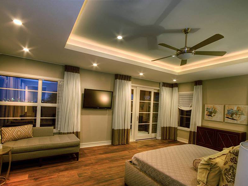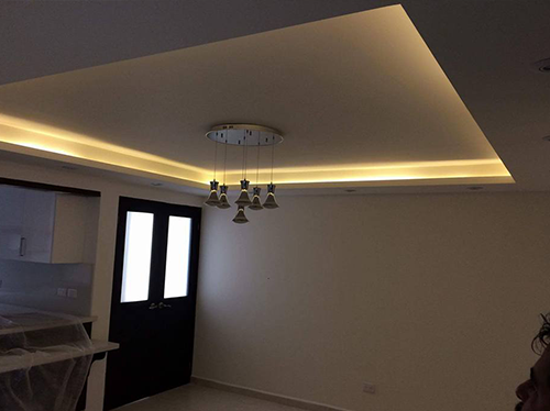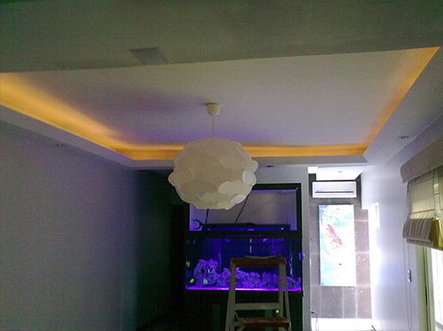 Es el detalle que se realiza principalmente en los plafones de tablaroca. Se logra dejando un espacio entre la losa y el acabado de la tablaroca en donde se oculta una manguera o tubo de luz, que al encenderse refleja contra las paredes de la losa y el plafón, creando una iluminación indirecta del área.